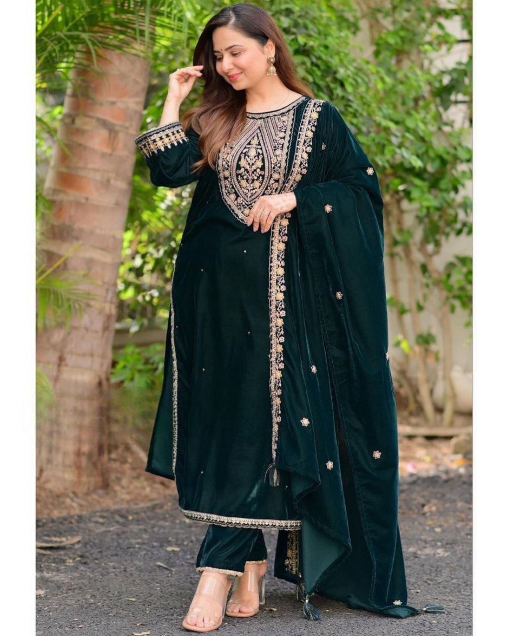Designer Dark Green Mirco Velvet Embroidery Work Pant Suit With Dupatta