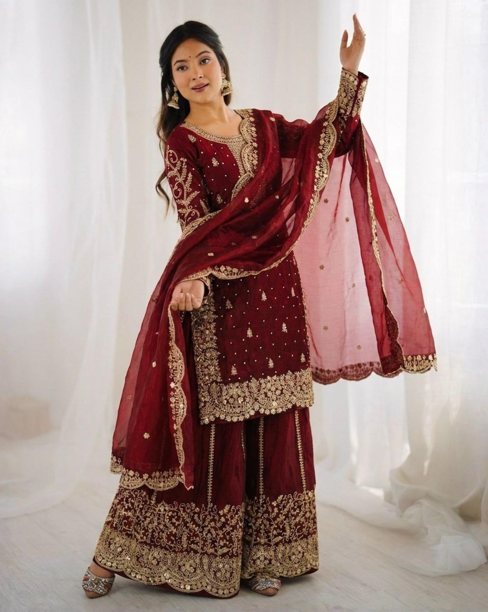 Exclusive Maroon Sea Green Simmer Silk Embroidery Palazo Kurti With Dupatta