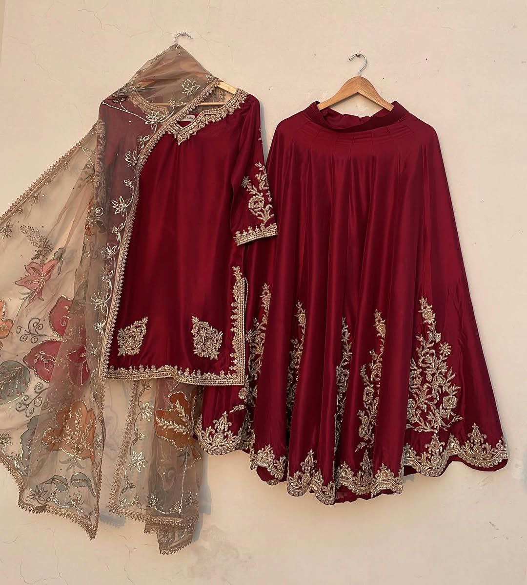 Exclusive Red Chinon Silk Embroidery Work Sharara Suit With Dupatta