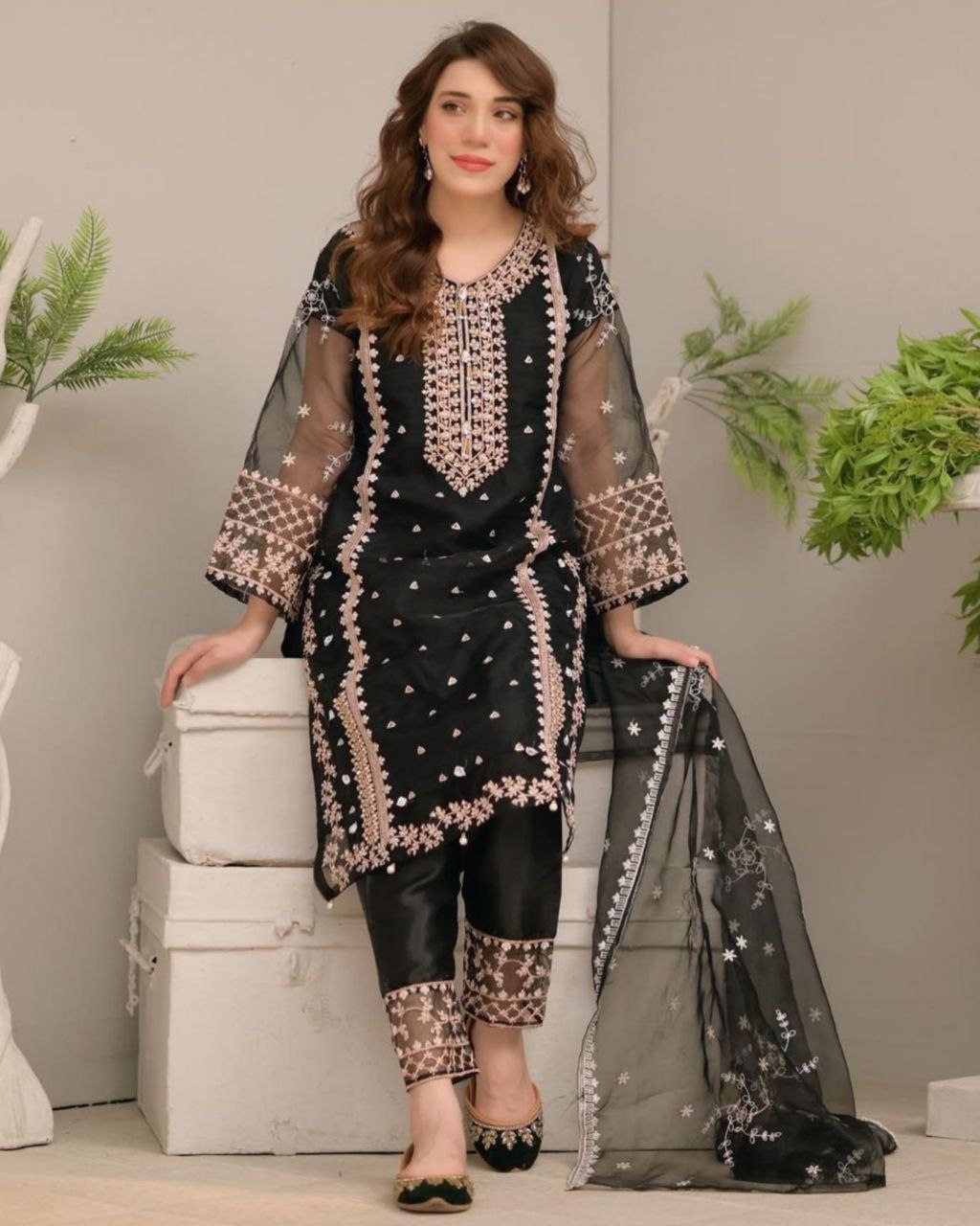 Ready To Wear Black Organza Silk Embroidery Work Pakistani Suit With Dupatta