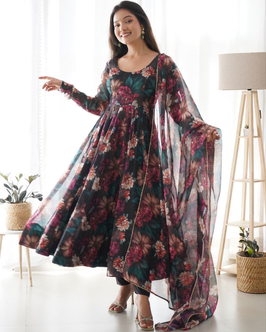 Ready To Wear Black Pure Soft Organza Silk Floral Print Work Anarkali Suit With Dupatta