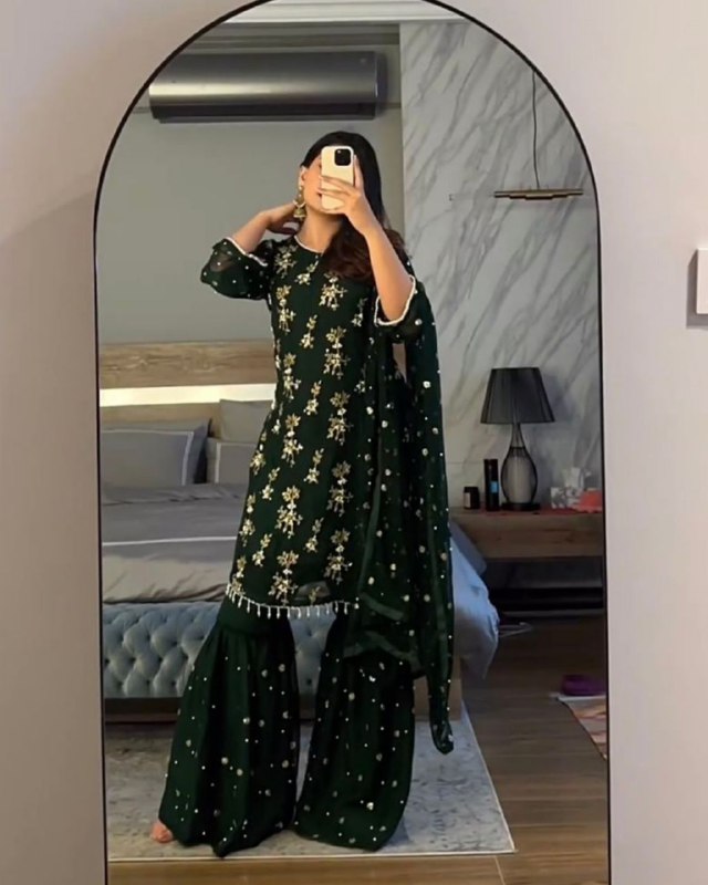 Ready To Wear Bottle Green Pure Georgette Embroidery Work Gharara Suit With Dupatta