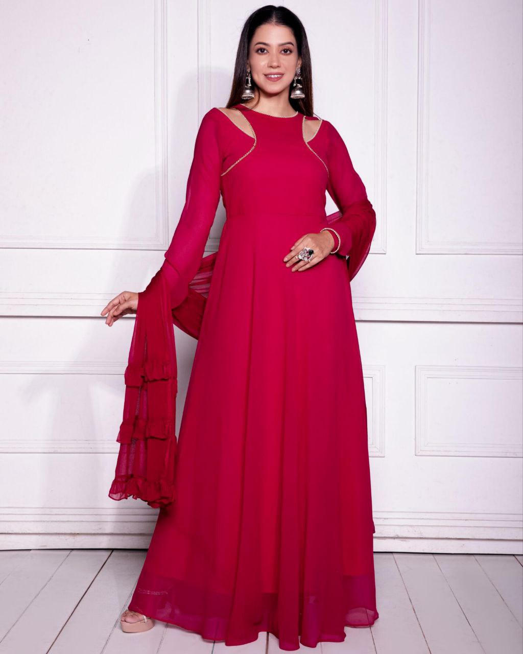 Ready To Wear Rose Red Faux Georgette Ruffle Work Gown With Drapped Dupatta