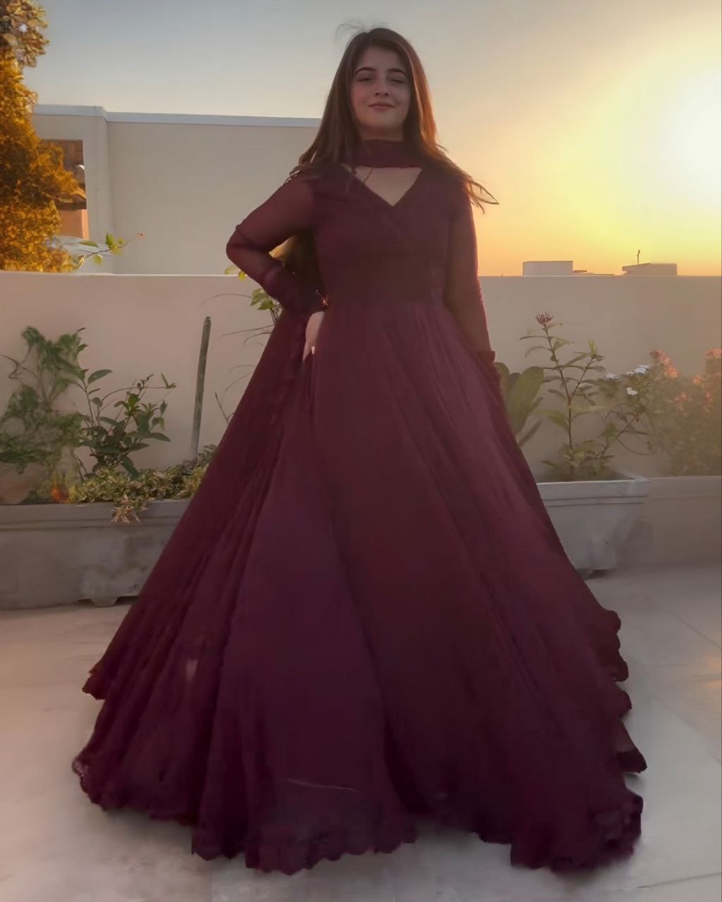 Ready To Wear Wine Pure Georgette Lace Work Anarkali Gown With Dupatta