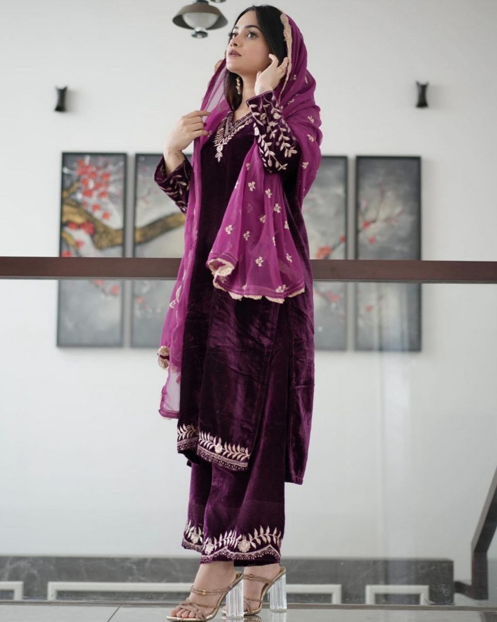 Ready To Wear wine Pure Velvet Embroidery Work Plazzo Suit With Dupatta